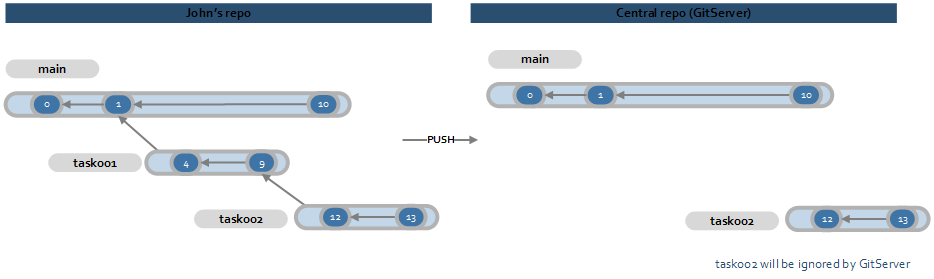 A side by side screenshot of the visual branch explorer in UVCS compared with the branch explorer for the central repository (GitServer). The screenshot shows that a branch not directly linked to main is ignored by GitServer.