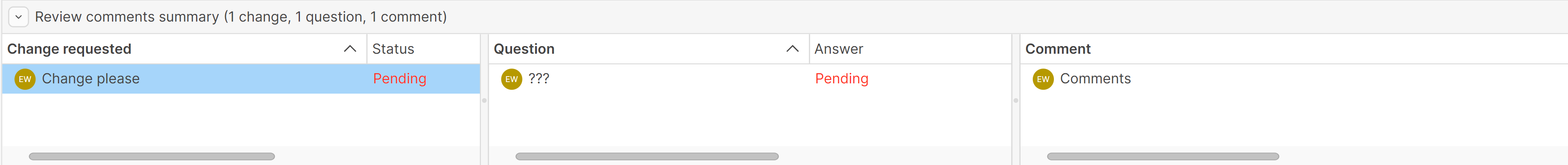 A screenshot of the review comments summary panel. The panel is split into three sections for each type of comment. The change requested and question comment sections both have a status column, which both show the status as pending.