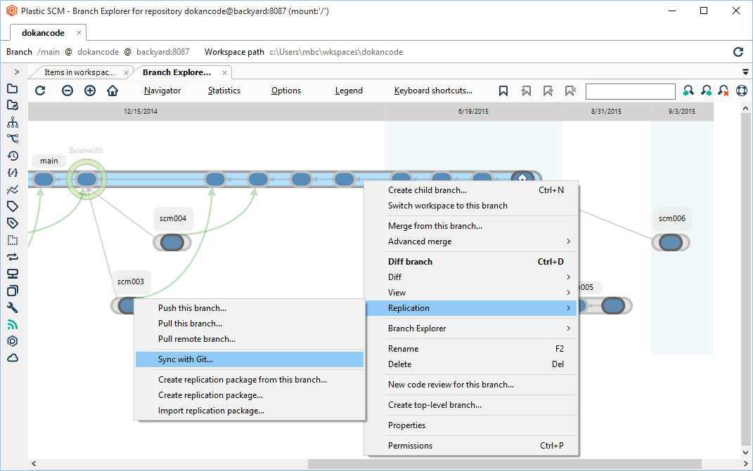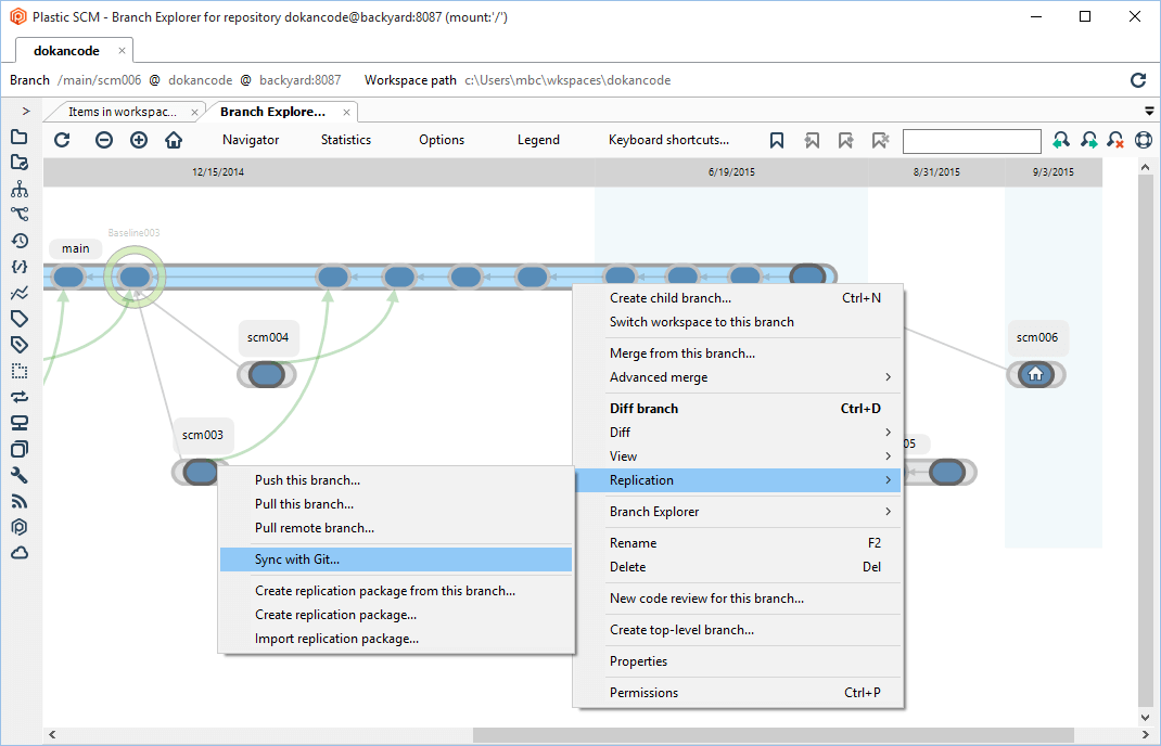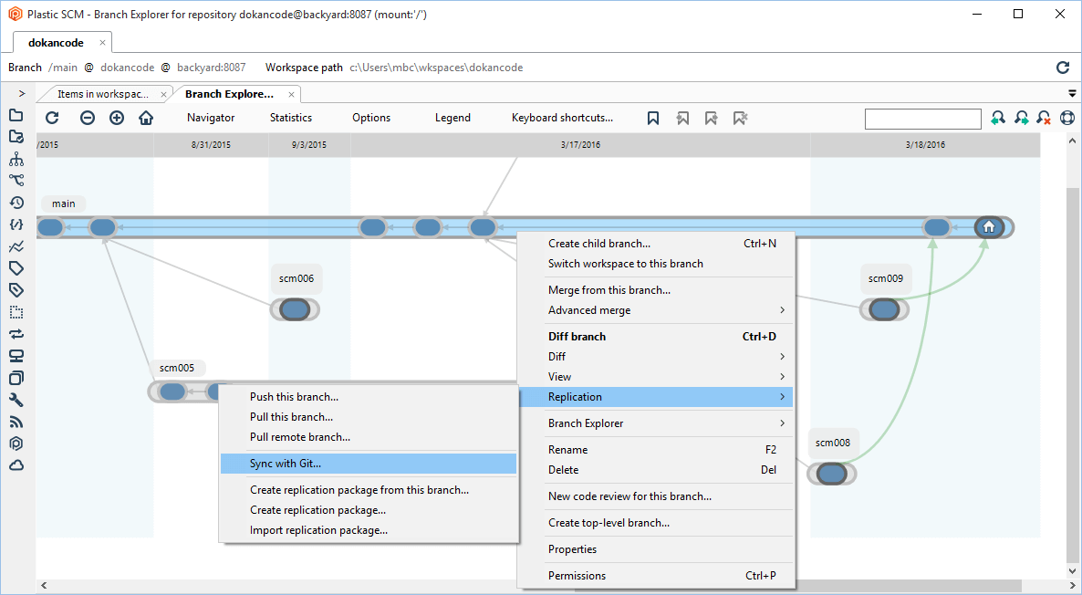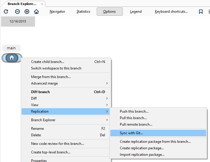 In this example, the dokancode UVCS repo is used. In the Branch Explorer view, right-click one of its branches and select the Sync with Git menu option: