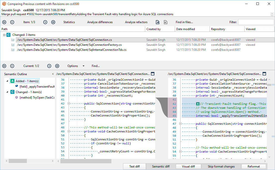 - And now, right-clicking any changeset (commit in Git jargon), you'll be able to check differences with our built-in diff system: