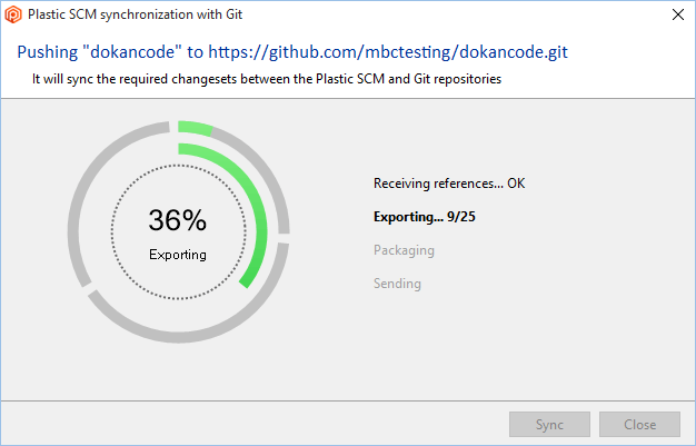Assuming the GitHub dokancode repo is empty, GitSync will calculate the changesets and branches it needs to push from the UVCS repo, and will push them:cm sync dokancode git https://github.com/mbctesting/dokancode.gitOnce the push operation is finished, you can see a summary of the objects that have been exporting: