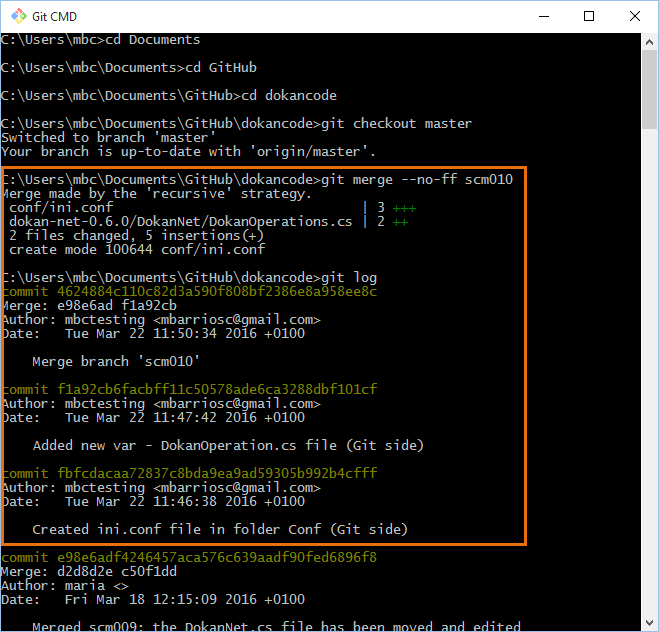 Once the commits are done, perform a merge from the branch (in this case, scm010) to the master branch:
