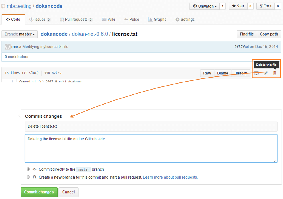As seen in the How it works section, you can make changes concurrently both in UVCS and Git. This means that you can work on the same branch on the two systems and reconcile changes (as you do when using a pure UVCS or Git environment). In the Changes on the Git side section, some changes were made on GitHub:- In the master branch - The license.txt file was deleted, the dokan-net-0.6.0\readme_dokan.txt file was edited, and moved to the dokan-net-0.6.0\DokanNet folder.