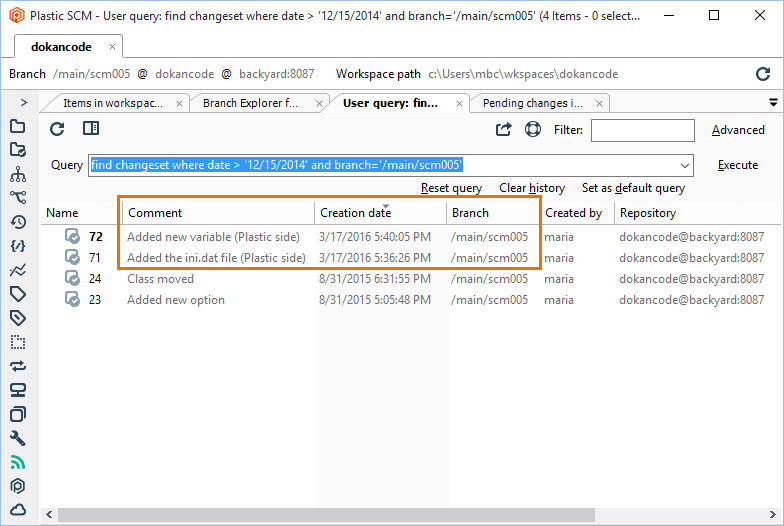 As an example, changes are made to the scm005 branch. At this point, both the Git and UVCS have the same content. You can check it on both sides: