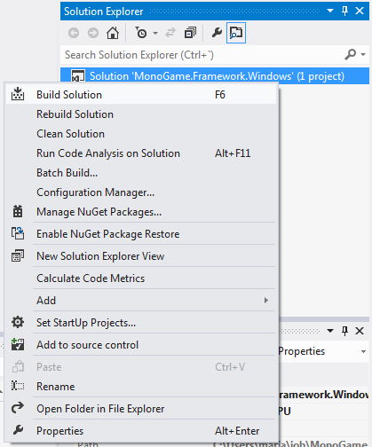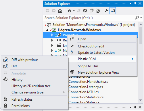 UVCS provides several commands when right clicking a file or folder in the Visual Studio Solution Explorer.