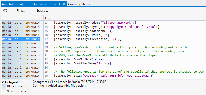 Display a dialog in which you choose two revisions of the selected item and then open a Side-by-side Diff tool to compare those revisions. By default, one of the revisions is the item as it exists in your workspace.Annotate