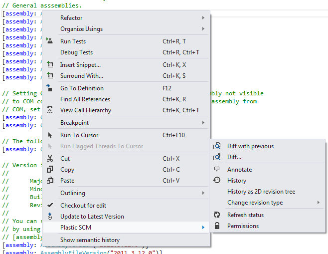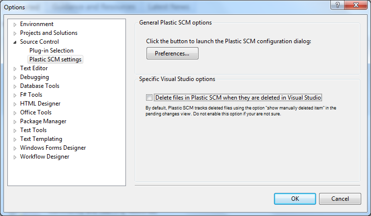 Additional options can be configured inside Visual Studio once the "Plastic SCM Source Control Package" has been selected as the source control plug-in. Go to:Tools > Options > Source Control > Plastic SCM settings