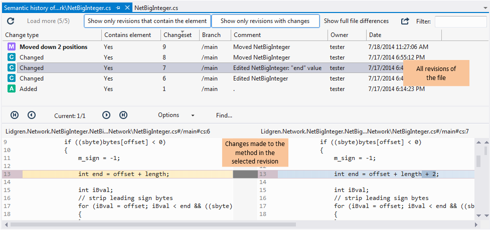 - Show full file differences / Show only element differences: Show in the bottom pane all the differences in the file. Or show only the differences involved in the selected method.