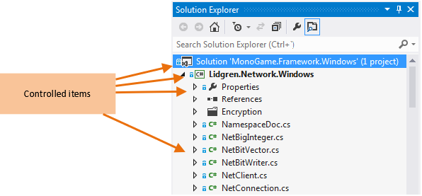 Once the solution is bound to UVCS, most of the changes in the solution are handled transparently by the integration. When a file is modified, it is automatically checked out. When a file is moved (even between projects), the change is detected as a moved item. You can review all the pending changes by right clicking in the solution in the Solution Explorer and selectingCheckinItems Commands