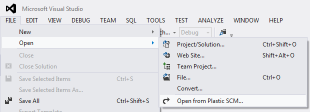 When the solution has already been added to UVCS by another user, you can directly open it from within Visual Studio. To do so, go to:File > Open > Open from Plastic SCM...