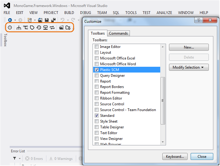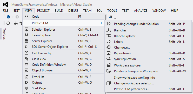 Most of the work in Plastic SCM happens inside a "view". The most relevant views can be open right inside Visual Studio, through theView > Plastic SCM