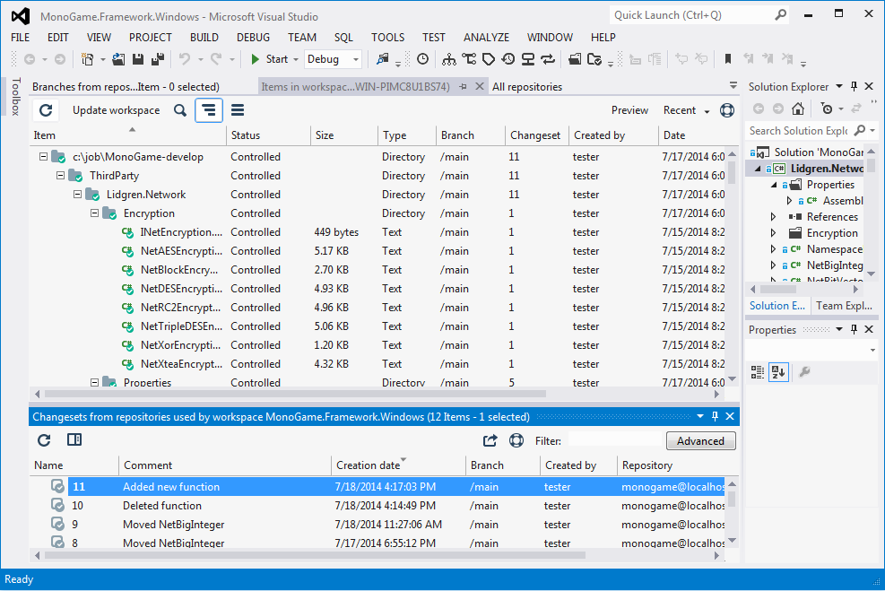 Unity Version Control System (UVCS) provides a comprehensive integration with Visual Studio 2010 and later versions. In the form of a Visual Studio Extensibility Package, this integration offers the user most of the functionality found in the UVCS GUI right inside Visual Studio.