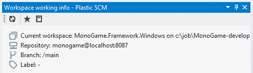 Open a workspace status view. It contains details about the workspace, such as the location on disk of the workspace as well as the repository and branch loaded in the workspace. This view is slightly different to the UVCS GUI counterpart (the workspace status bar) and is meant to be docked in a visible place inside Visual Studio. But the information shown is essentially the same.