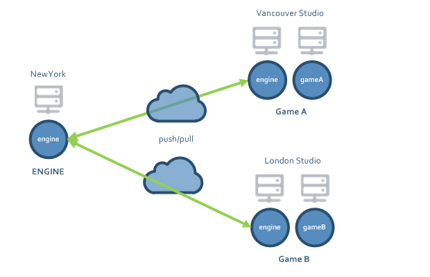 In the following xlink configuration example, a video game company has an engine that two different game studios use in different locations. You can use Xlinks to optimize this workflow and share the engine code with both studios and still continue individual development: