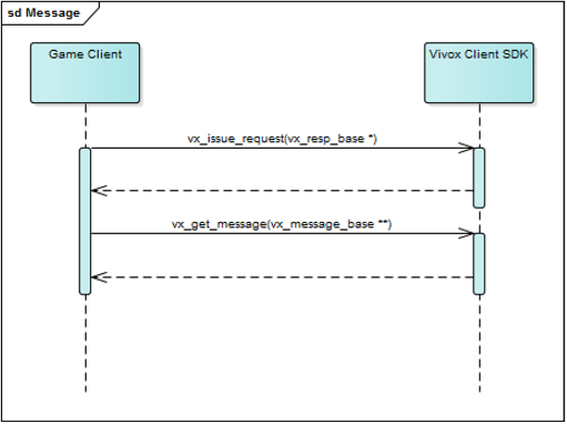 When the request completes, or when there is data available for the game client to use, the Vivox SDK makes a response message or an event message available to the game client. The game client gets access to this message by calling the