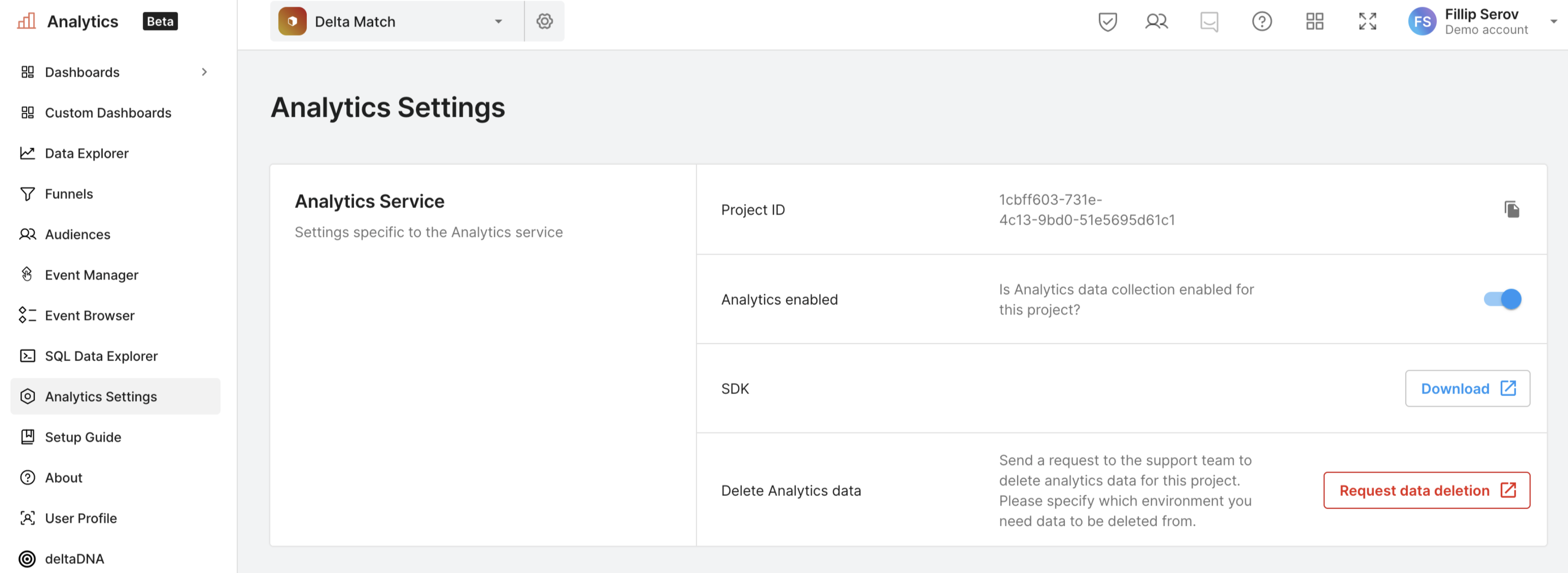 特定の Unity 環境のデータ削除をリクエストできます。これにより、ユーザーデータがすべて削除されますが、カスタムイベント、保存されたファネル、その他のレポートは削除されません。標準イベントデータとカスタムイベントデータのみがリセットされ、イベント定義やレポートなどの設定は削除されません。 ダッシュボードメニューで Analytics Settings (Analytics 設定) > Analytics Services (Analytics サービス) に移動し、Request data deletion (データ削除をリクエスト) をクリックします。データを削除する環境を指定するサポートリクエストを入力します。