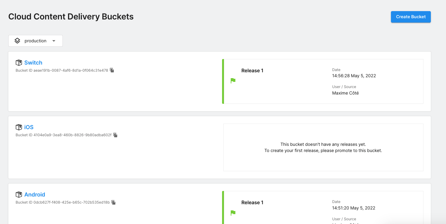 プロジェクト用に作成したリリースは、Releases (リリース) タブで管理できます。 リリースを作成するには、以下を行います。- Content Delivery Buckets (Content Delivery バケット) ページから、未リリースの変更を含むバケットを選択します。
