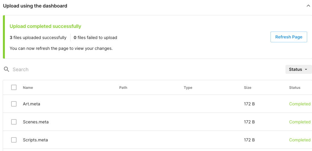 ファイルのアップロード後に、プロセスの概要を示すボックスが表示されます。Refresh Page (ページを更新) をクリックして、バケットの情報のステータスを更新します。