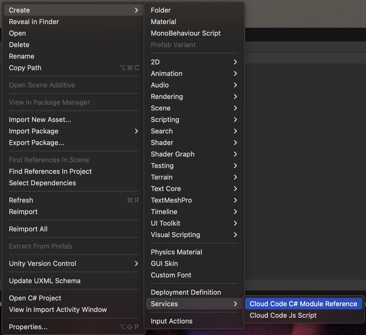 使用の準備をするには、Cloud Code C# モジュールリファレンスファイルを作成します。このファイルは、デプロイしようとする C# モジュールプロジェクトを含むソリューションのリファレンスです。- Unity エディターで、Project (プロジェクト)を右クリックし、Create (作成) > Services (サービス) > Cloud Code C# Module Reference (Cloud Code C# モジュールリファレンス) を選択します。