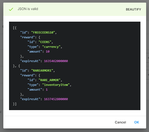 この例の 1 つの欠点は、クーポンの設定しやすさです。新しいクーポンの作成または既存のクーポンの無効化にはコードの変更が必要であり、十分な柔軟性が提供されません。Remote Config でクーポンをカスタム JSON 値として定義できます。