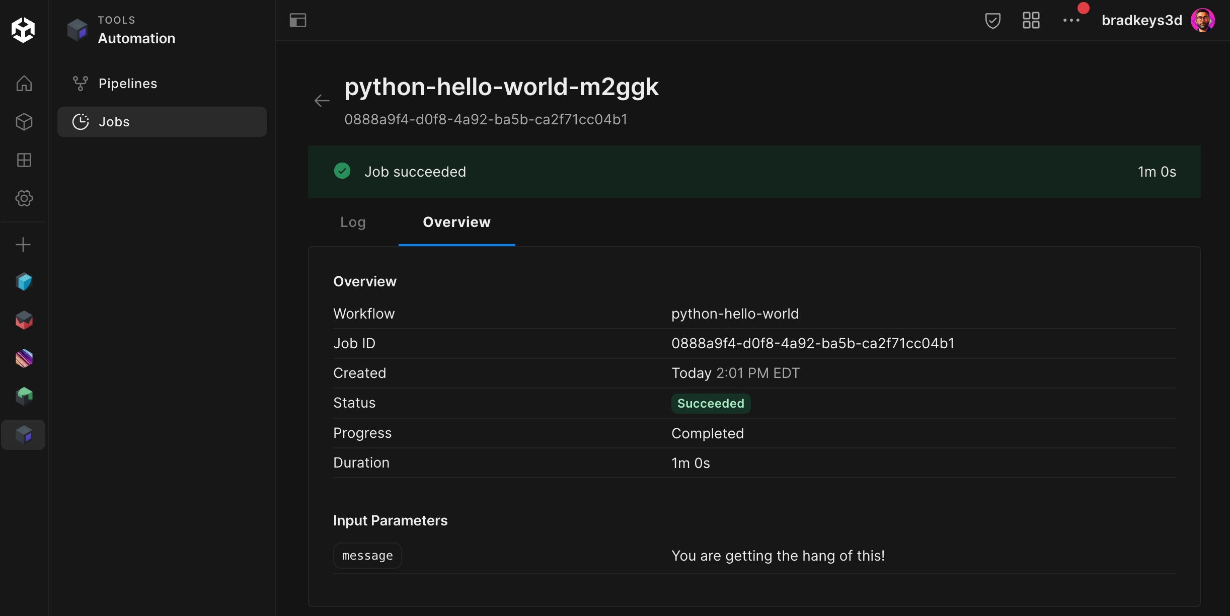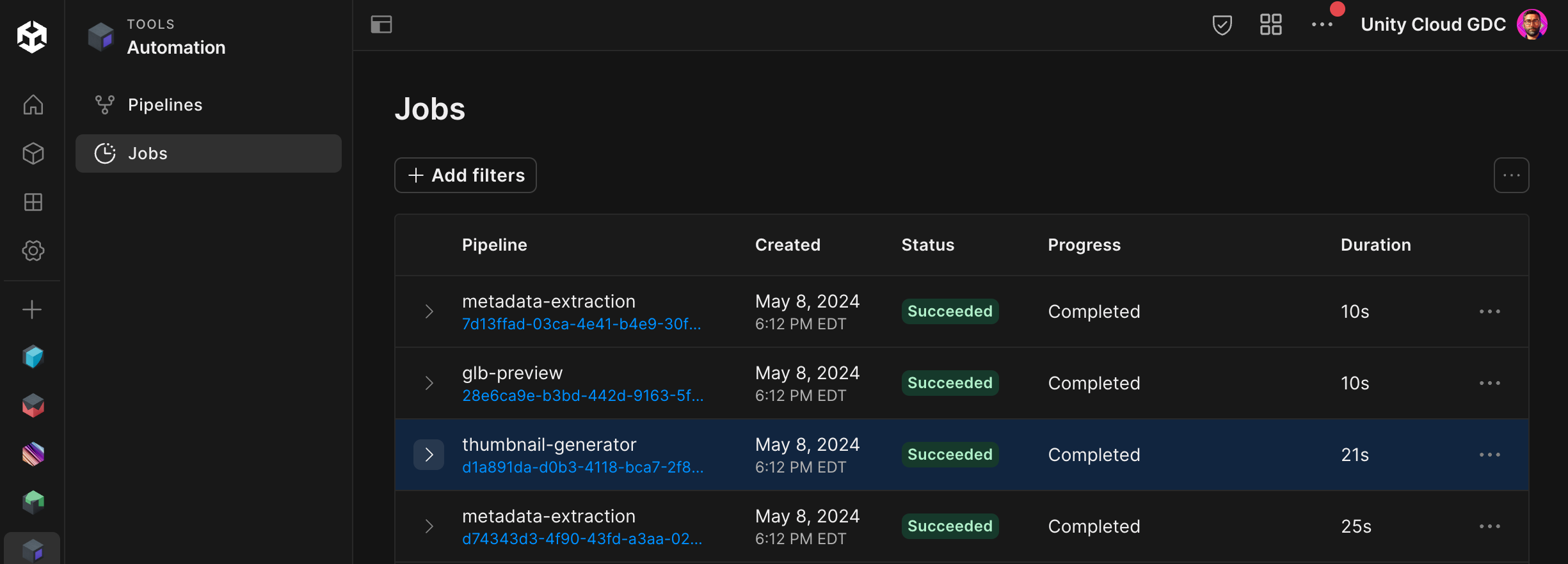 You can watch active jobs progress through their steps, get the output data from completed jobs, rerun jobs, and check job logs to help debug issues.