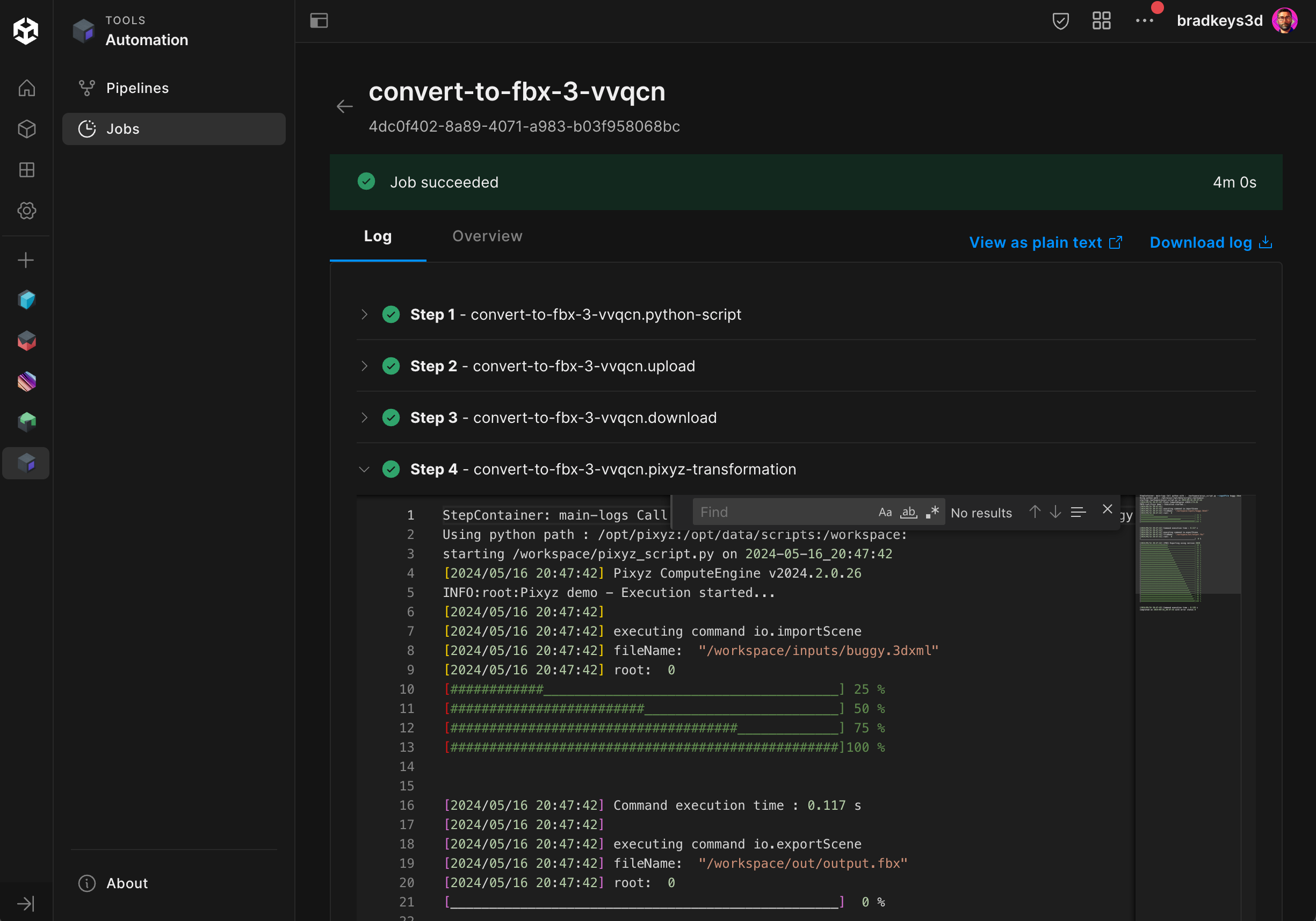 Each step in a job contains logs that may provide helpful information, especially if the job failed. Use the logs to debug issues when creating a pipeline, or to determine why your input data might be invalid for a particular pipeline. To view job logs:- View details for a job