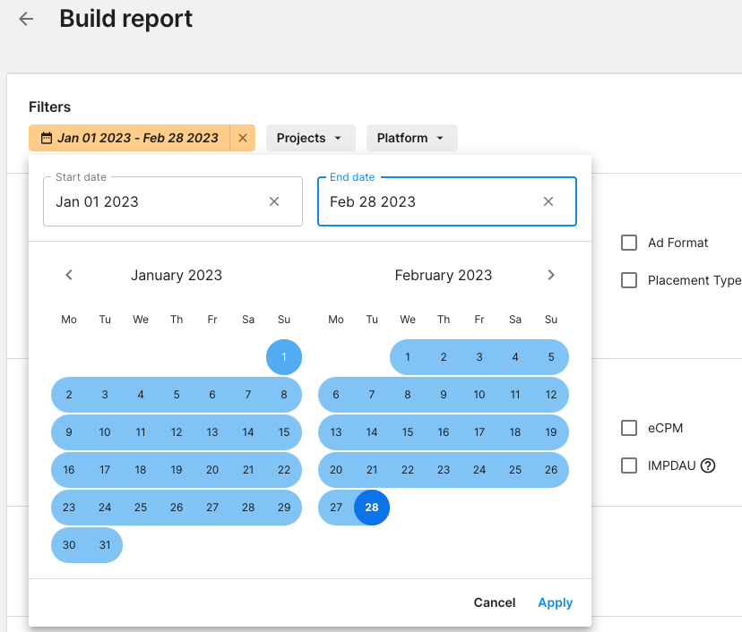 - Desired breakdowns (必要な分類): プロジェクト、広告フォーマット、プレースメント、ゲーム ID/アプリ ID、国、プレースメントタイプ、プラットフォーム、広告ユニット、SDK バージョン。
