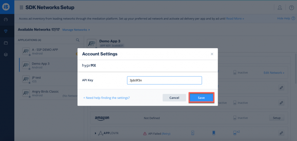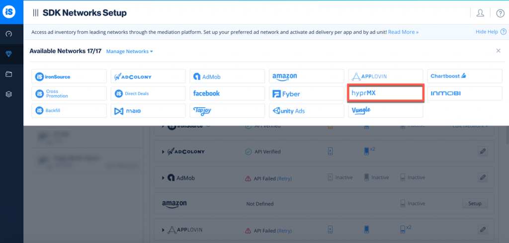 - Select HyprMX from the list of available Ad Networks and input the HyprMX API Key.