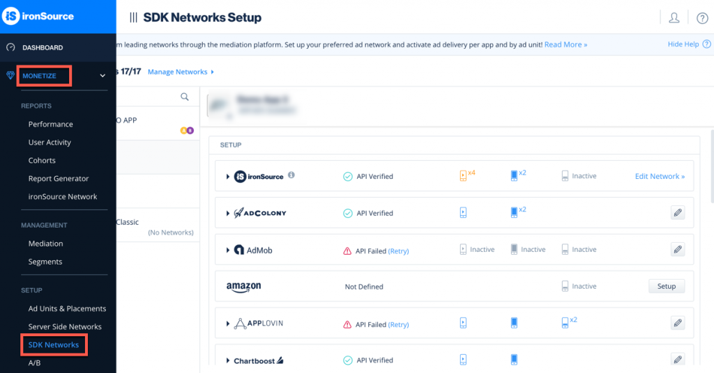 - When you obtain the above parameters, log in to your LevelPlay account and go to Monetize > SDK Networks.