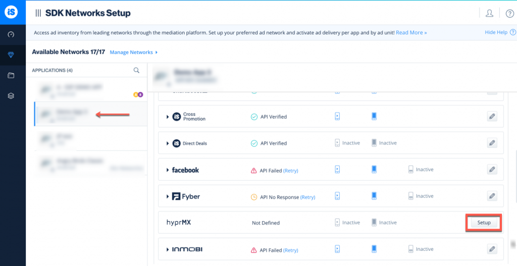 - Next, select the app on which you'd like to run LevelPlay Mediation with HyprMX and select the Setup button. Then enter the Distributor ID and Placement Name in the relevant fields.