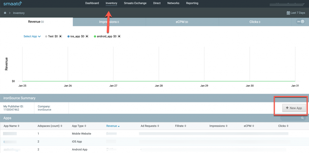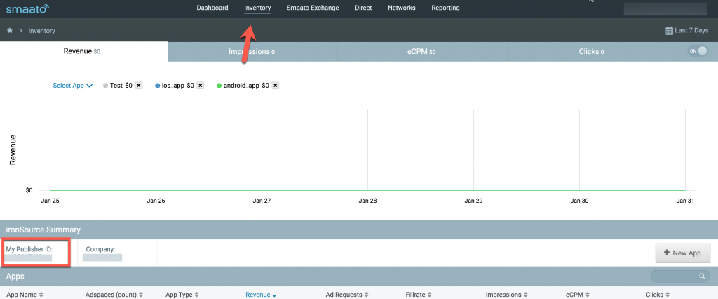 Follow these steps to retrieve your Smaato account keys which need to be inserted into your LevelPlay Network Setup Module in order for Smaato to work correctly in connection with LevelPlay:- Publisher ID – In your Smaato account go to Inventory > Publisher ID