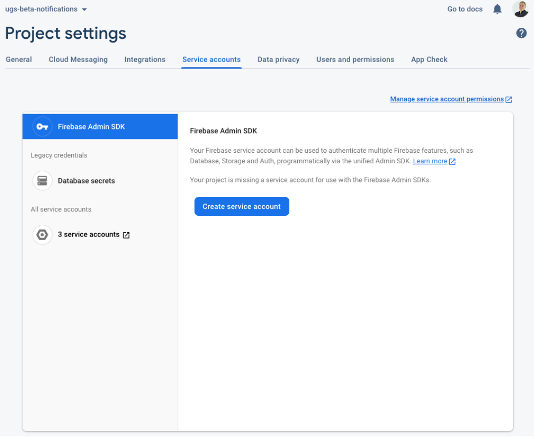 Unity Gaming Services ダッシュボードから通知を送信するには、Firebase (Android) および Apple Developer アカウント (iOS) からサービスキーをアップロードする必要があります。- Firebase コンソール に移動して、プロジェクトを選択します。