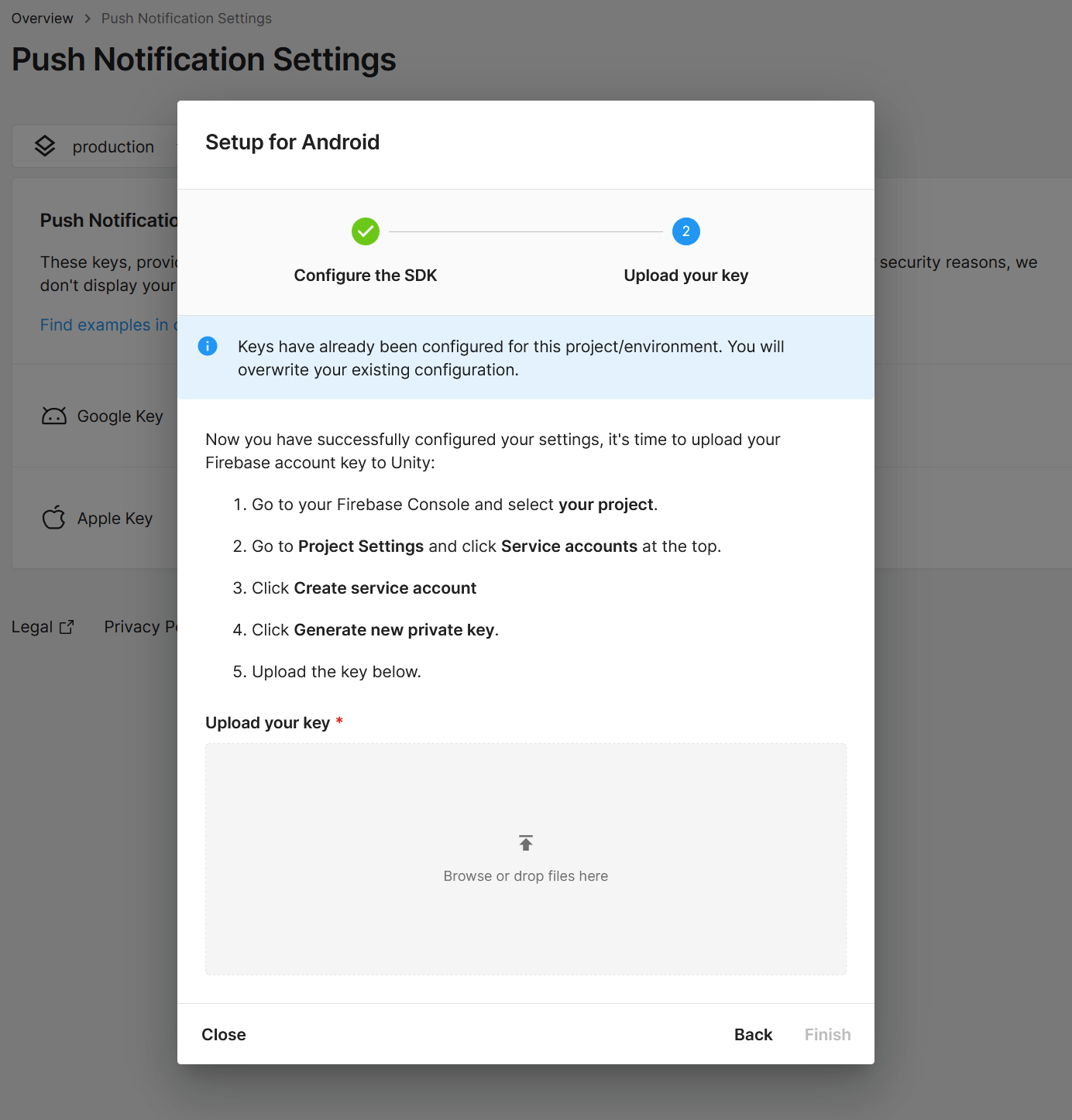 - キーのアップロード: 秘密鍵 (Firebase および Apple) を見つけて、Unity Dashboard にアップロードします。
