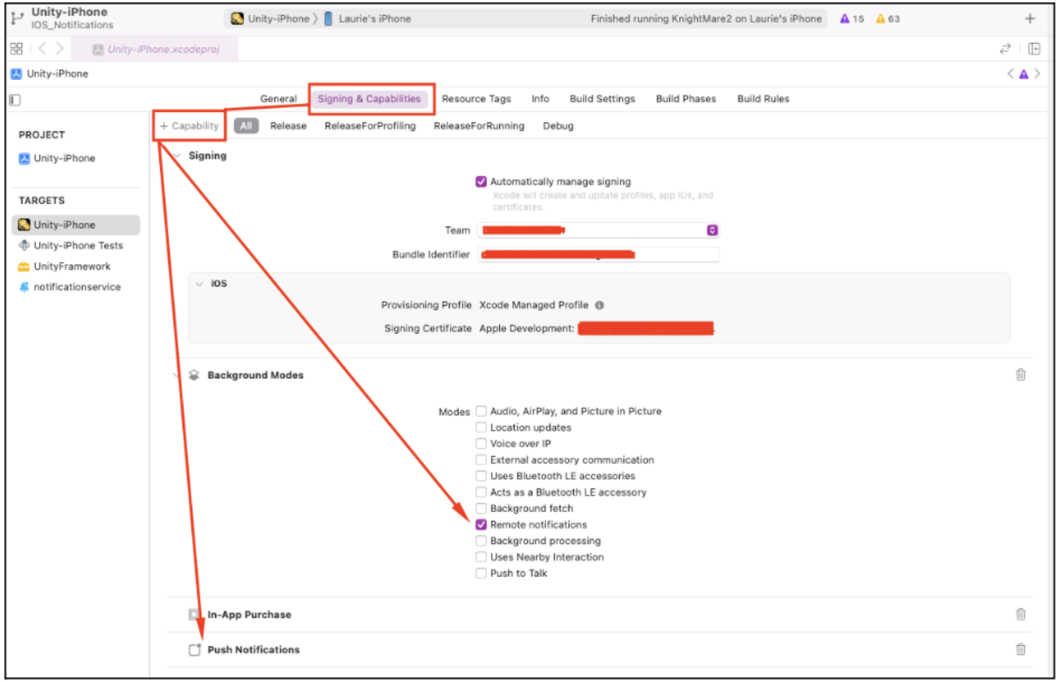 - XCODE 内でアプリケーションをビルドしているときは、そのアプリが通知を受け取ることができるように必ず Remote Notification (リモート通知) 機能を設定してください。