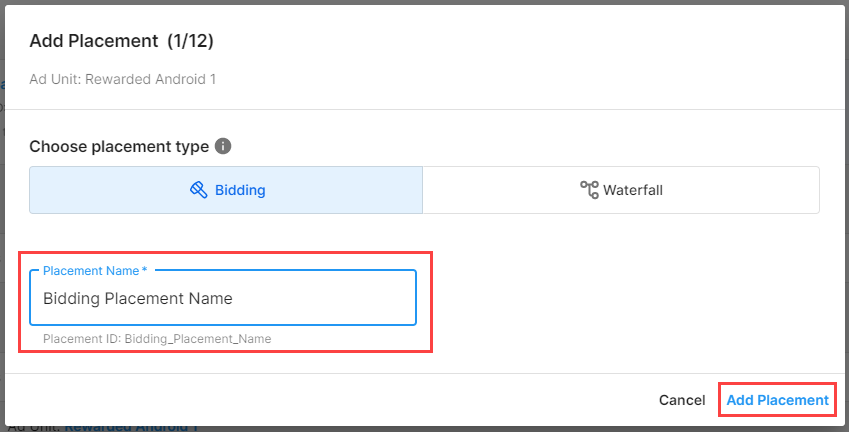 - Bidding을 선택하고 Placement Name을 입력합니다.
