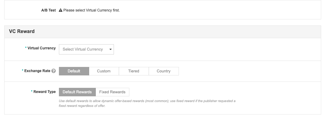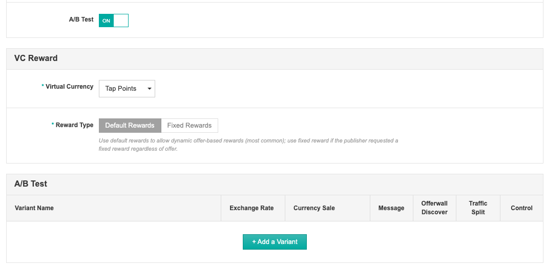 - Basic과 VC Reward 설정을 진행합니다. A/B 테스트 토글을 편집하려면 가상 재화가 필요합니다.