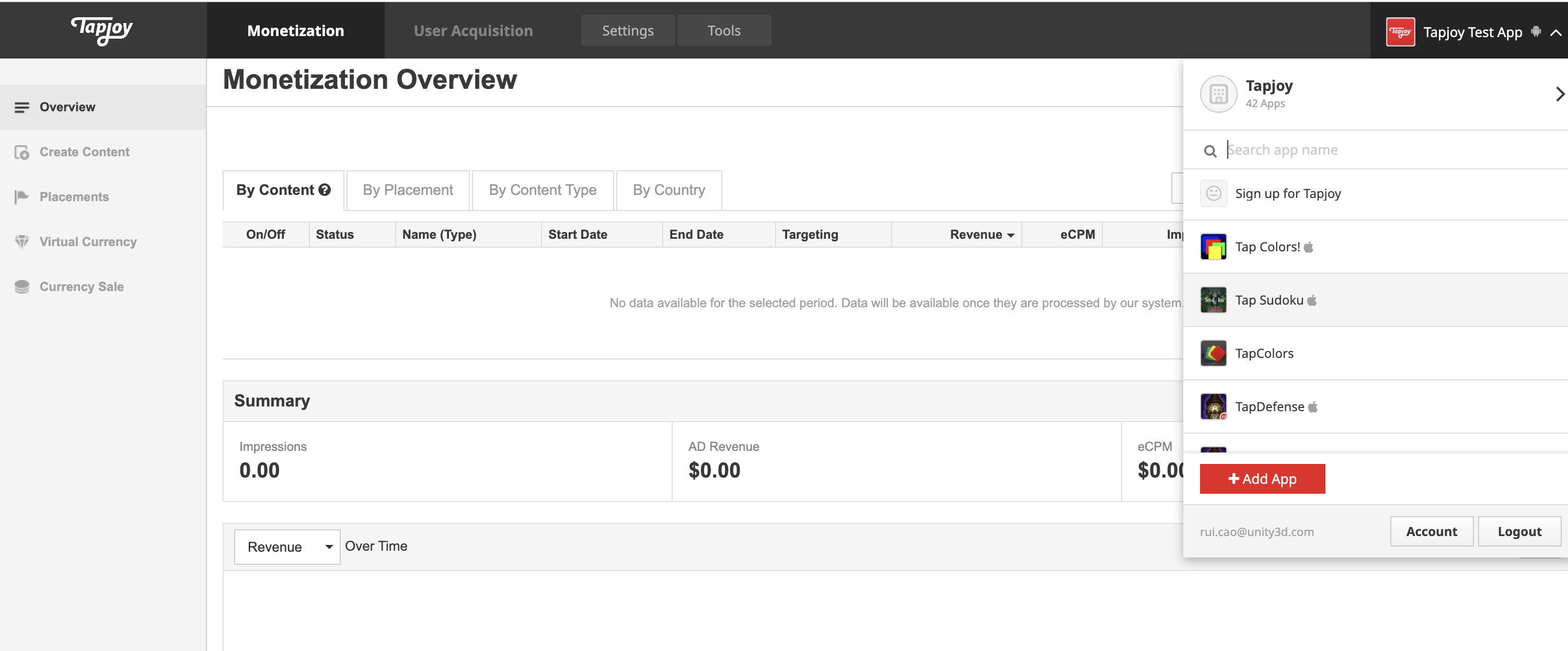 단일 플레이스먼트에서 여러 오퍼월을 설정할 수 있습니다. 오퍼월 카드 커스터마이징 기능을 활용하여 세그먼트별로 맞춤화된 오퍼월을 표시합니다. 이렇게 하면 다양한 재화로 특정 사용자, 코호트를 타게팅하여 성능을 최적화할 수 있습니다. 플레이스먼트가 호출되면 탭조이는 오퍼월 카드 목록을 순서대로 진행하고 해당 사용자에게 적용되는 첫 카드를 표시합니다. 플레이스먼트에 관해 자세히 알아보려면 여기에 나와 있는 내용을 확인하십시오. 다음 단계에 따라 오퍼월 카드를 생성합니다.- 왼쪽 내비게이션 메뉴의 Create Content로 이동합니다.