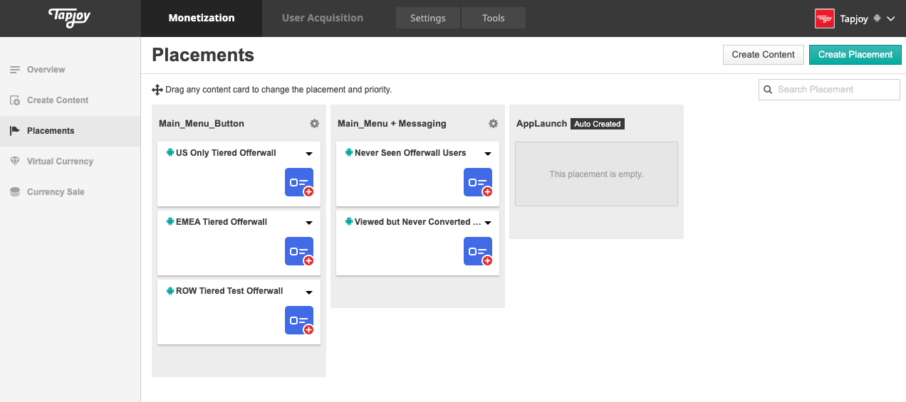 플레이스먼트는 사용자에게 오퍼월이나 설득력 있는 메시지를 표시하려는 앱 내 특정 위치입니다. 예를 들어 오퍼월 설정을 직접 호출하여 표시하는 대신 탭조이 대시보드에서 오퍼월 설정이 포함된 플레이스먼트를 호출합니다. 플레이스먼트 설정에는 기술적인 구현 작업이 필요하며, 오퍼월 설정 변경 사항은 탭조이 대시보드를 통해서만 관리할 수 있습니다. 코드 내에서 플레이스먼트를 구현하는 방법에 관한 자세한 내용은 각 플랫폼 페이지(iOS, Android, Unity, ReactNative)를 참고하십시오. 구현할 플레이스먼트에 대한 전략을 수립할 때 개발자와 팀원은 표준 오퍼월과 설득력 있는 메시지 모두 테스트하고 구현할 수 있는 최대의 유연성을 확보하기 위해 컨텍스트 플레이스먼트와 사용자 기반 플레이스먼트 모두 고려해야 합니다. 플레이스먼트에 관해 자세히 알아보려면 여기에 나와 있는 내용을 확인하십시오. 기술 팀에서 앱 코드 내에 플레이스먼트를 지정하면 다음 단계에 따라 Unity Dashboard에서 플레이스먼트에 연결합니다.- 왼쪽 내비게이션 메뉴의 Placements 탭으로 이동합니다.
