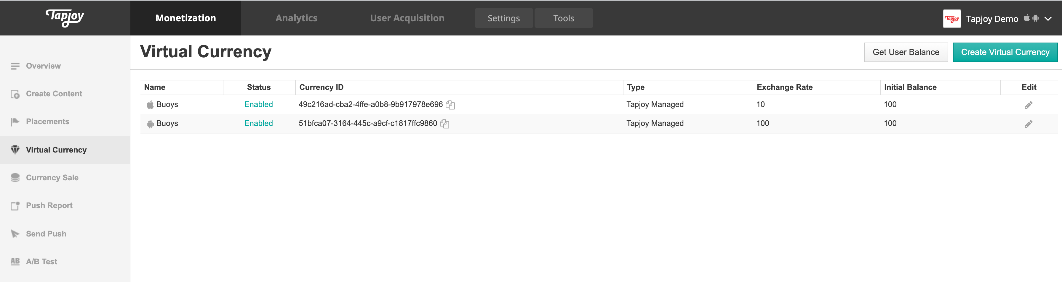 오퍼월에서 테스트 오퍼를 확인하려면 애플리케이션에 테스트 디바이스를 추가할 수 있습니다. 이렇게 하면 테스트 오퍼가 오퍼월 상단에 표시되어 재화 테스트를 쉽게 수행할 수 있습니다. 탭조이 관리형 재화 구현이 제대로 작동하는지 확인하는 또 다른 툴로는 탭조이 대시보드의 'Get User Balance' 툴이 있습니다.