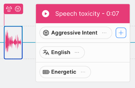 오디오 섹션은 서로 다른 색으로 표시됩니다. 예를 들어 Safe Voice가 오디오 순간에서 유해성을 감지하면 해당 순간은 보라색으로 나타납니다. 분홍색으로 표시된 순간은 오디오 방해를 나타냅니다. 회색으로 표시된 순간은 유해성과 방해가 되는 동작이 없는 것입니다. 영어 이외의 언어로 된 순간은 주황색으로 강조 표시됩니다. 순간 분석에 대한 자세한 내용은 순간을 클릭하여 순간 툴팁을 열어 확인하시기 바랍니다.