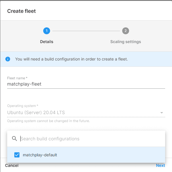 Continue to set up the build configuration. Complete the fields and enter Matchplay.x86_64 in the game server executable field.