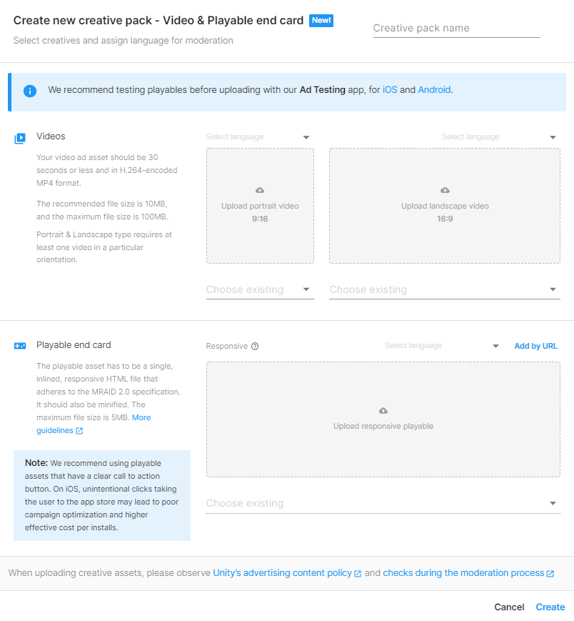 Make a creative pack with a video and Playable end card in the User Acquisition dashboard.