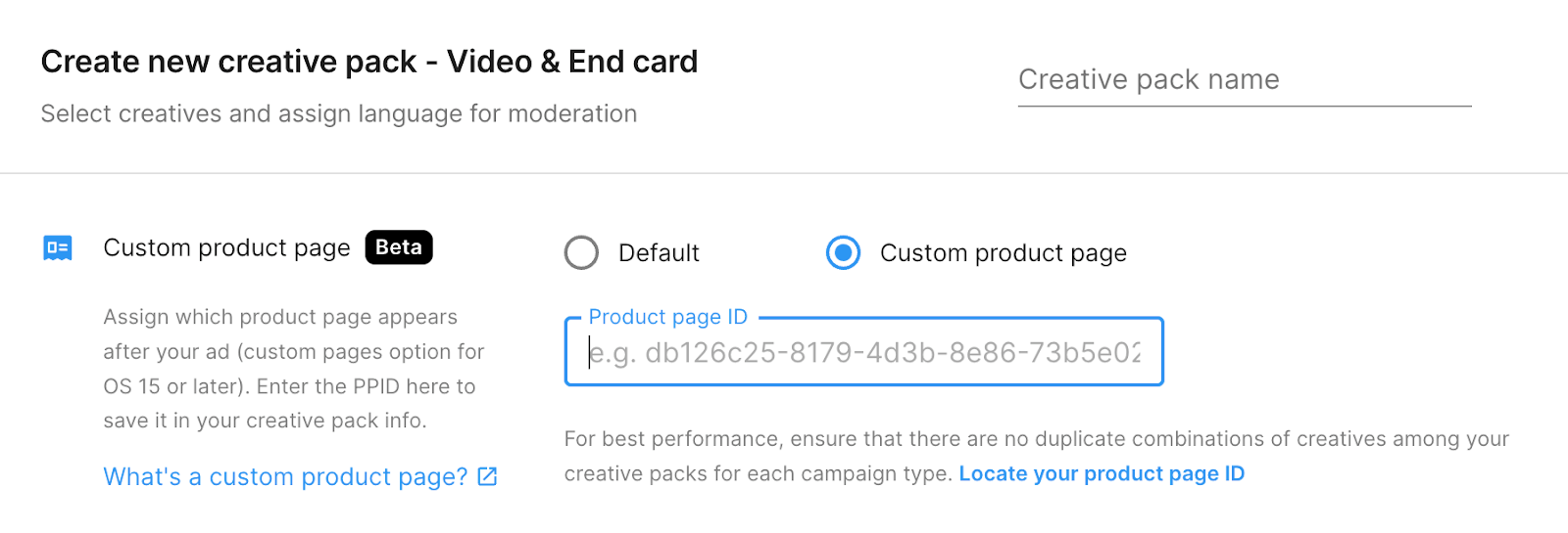 Để thêm trang sản phẩm tùy chỉnh vào gói quảng cáo hiện có, hãy vào mục Creative packs của cài đặt Campaign:- Xác định gói quảng cáo mà bạn muốn kết nối với trang sản phẩm tùy chỉnh. Việc chọn gói sẽ mở rộng chi tiết gói quảng cáo.
