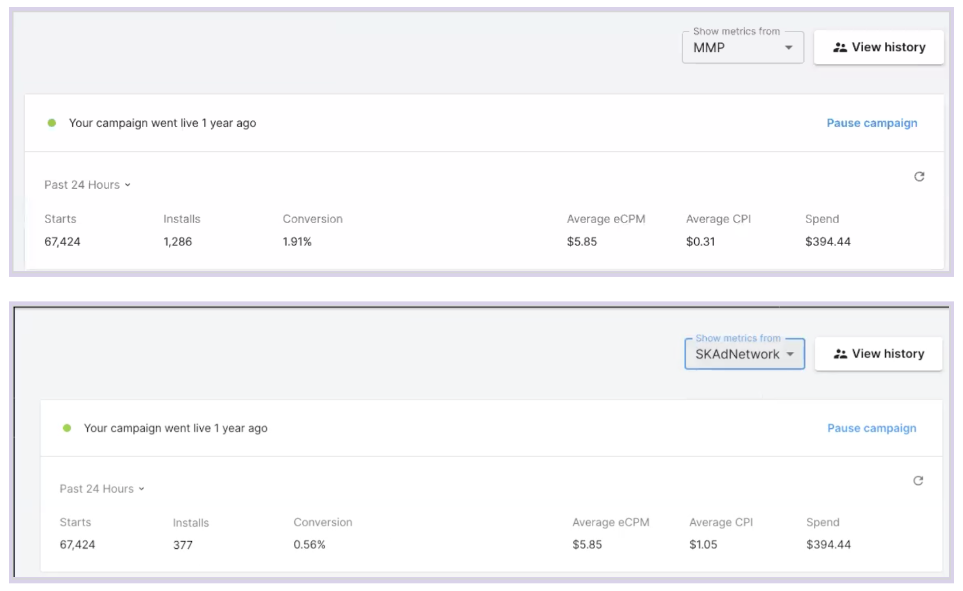 If you have data from SKAdNetwork postbacks, you can switch between dashboard metrics for Mobile Measurement Partners (MMP) and the SKAdNetwork in Report Builder. The following is a comparison of MMP data against SKAdNetwork data from the last 24 hours for a test account:
