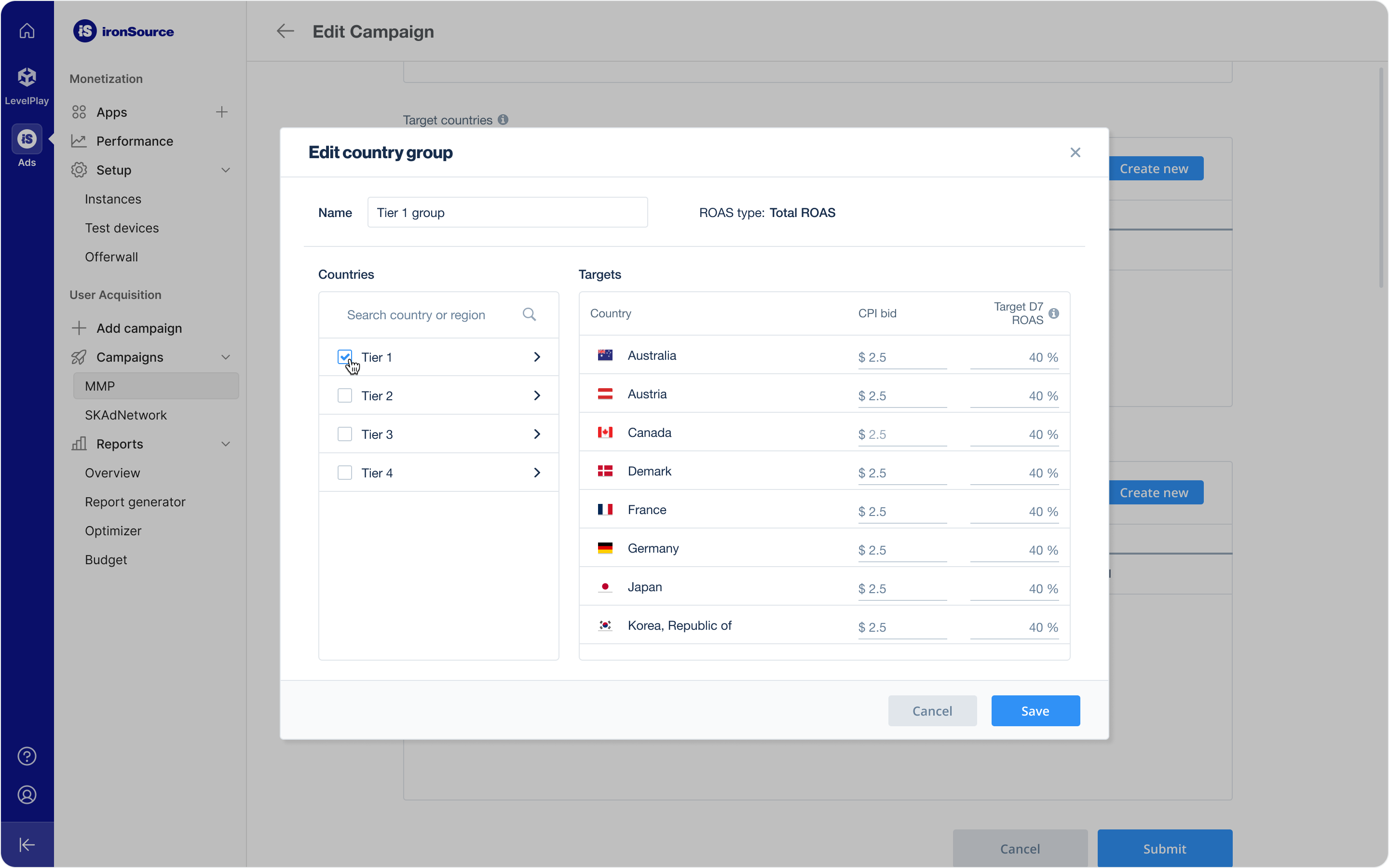 With manual optimization, set a dedicated static CPI bid for each country in the Target countries section of the campaign setup. Select Create New to select countries and set bids for your campaign. If you use ROAS or event optimization, you can set a tROAS or tCPE goal in addition to your static CPI bid for each country.Step 5: Creative Sets