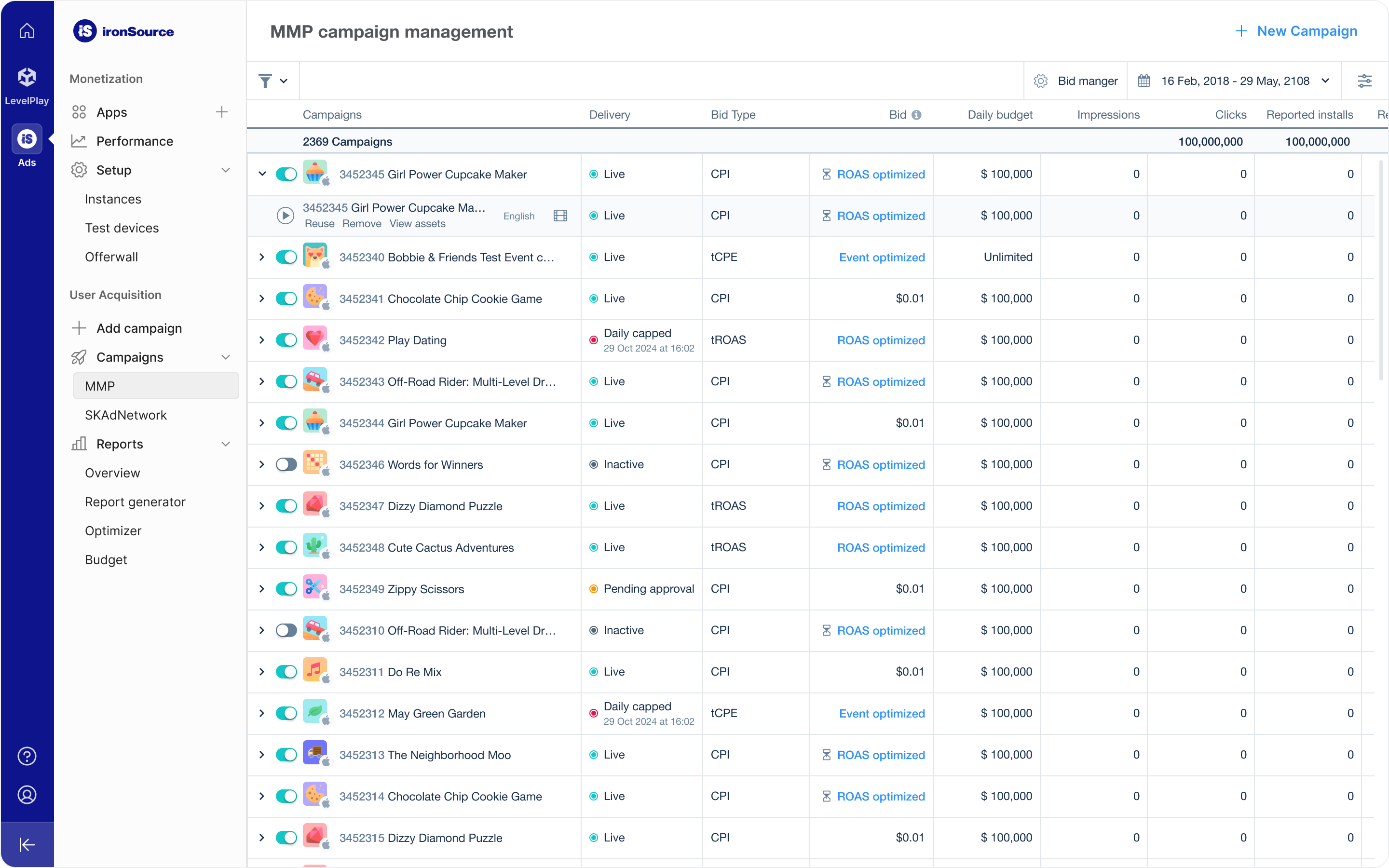 Promote your app and drive new users to download it with an ironSource Ads user acquisition campaign. To get started setting up a new campaign, go to the Campaign Management page of the ironSource Ads platform and click New Campaign.