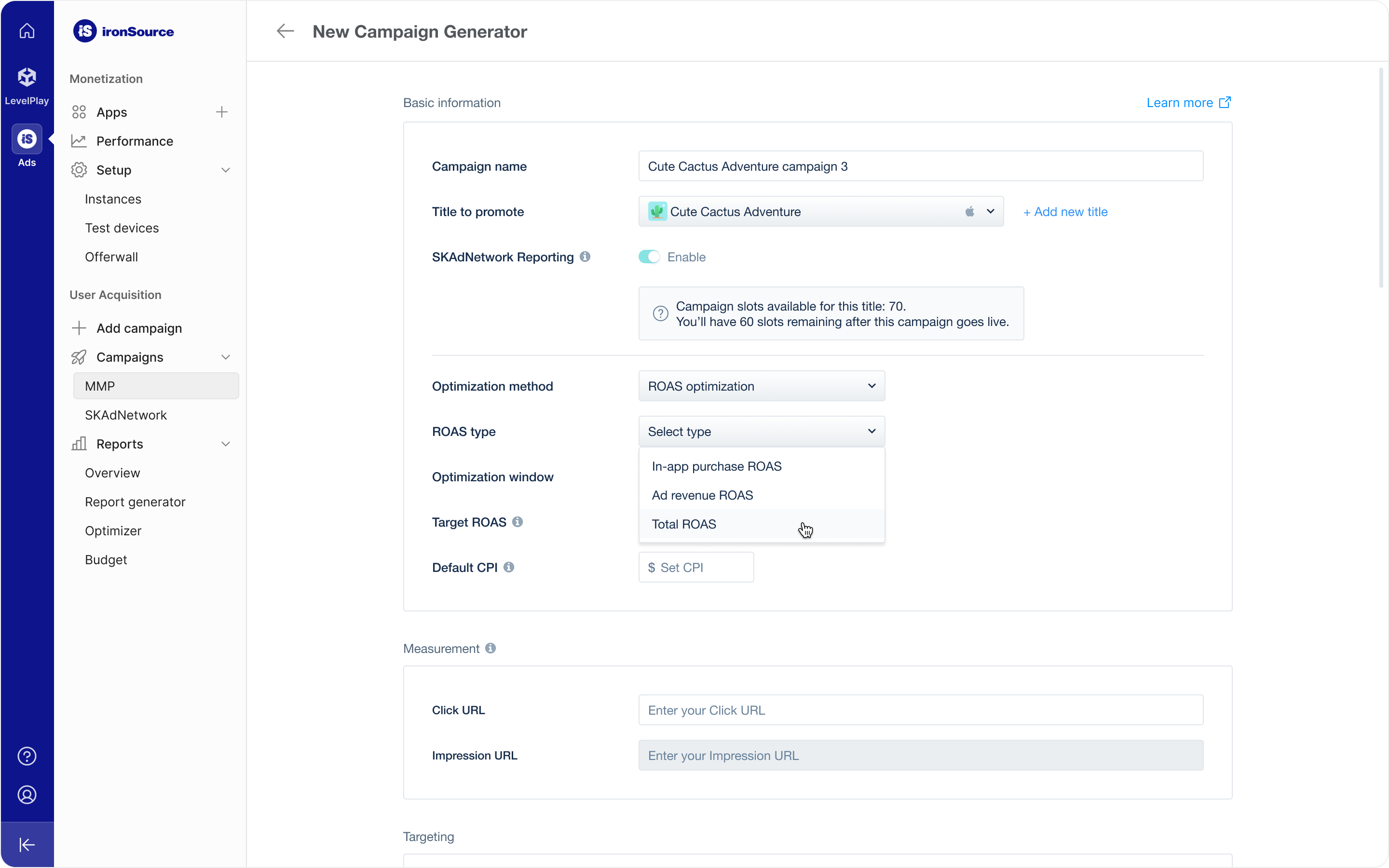 Give your campaign a name and choose the title you want to promote. You can select a title from the drop-down menu or add a new one. When you set up a campaign for iOS titles, ironSource Ads automatically enables SKAdNetwork Reporting. Each iOS SKAN campaign uses a portion of the 70 available slots for each title. To make slots available again, suspend an active iOS SKAN campaign. You can change the Basic Information fields aside from Title at any time. After choosing your title and giving your campaign a name, select what optimization method you want to use. Choose from the following optimization methods with the ironSource Ads network:ROAS optimization