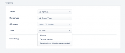 To set up a cross promotion campaign, you can either create a new campaign or run cross promotion in an existing campaign. Contact your account manager for help. When creating a new cross promotion campaign, ensure you select Target only my titles from the Titles options. To switch to cross promotion in your existing campaigns, select Target only my titles from the Titles dropdown in the Targeting section of the campaign details. This enables the campaign to start running on the cross promotion bidder when you activate cross promotion in the ironSource Ads platform.Step 4: Bids, Countries and Budgets