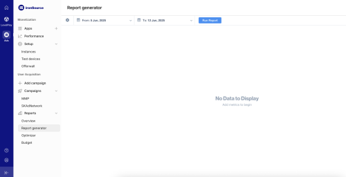 Select the relevant metrics to perform detailed analysis of the campaigns. The available metrics are described in the user acquisition glossary. After you have selected a date range and determined the metrics, select Run Report. The report will be generated and presented on the screen.Step 4: Export your data