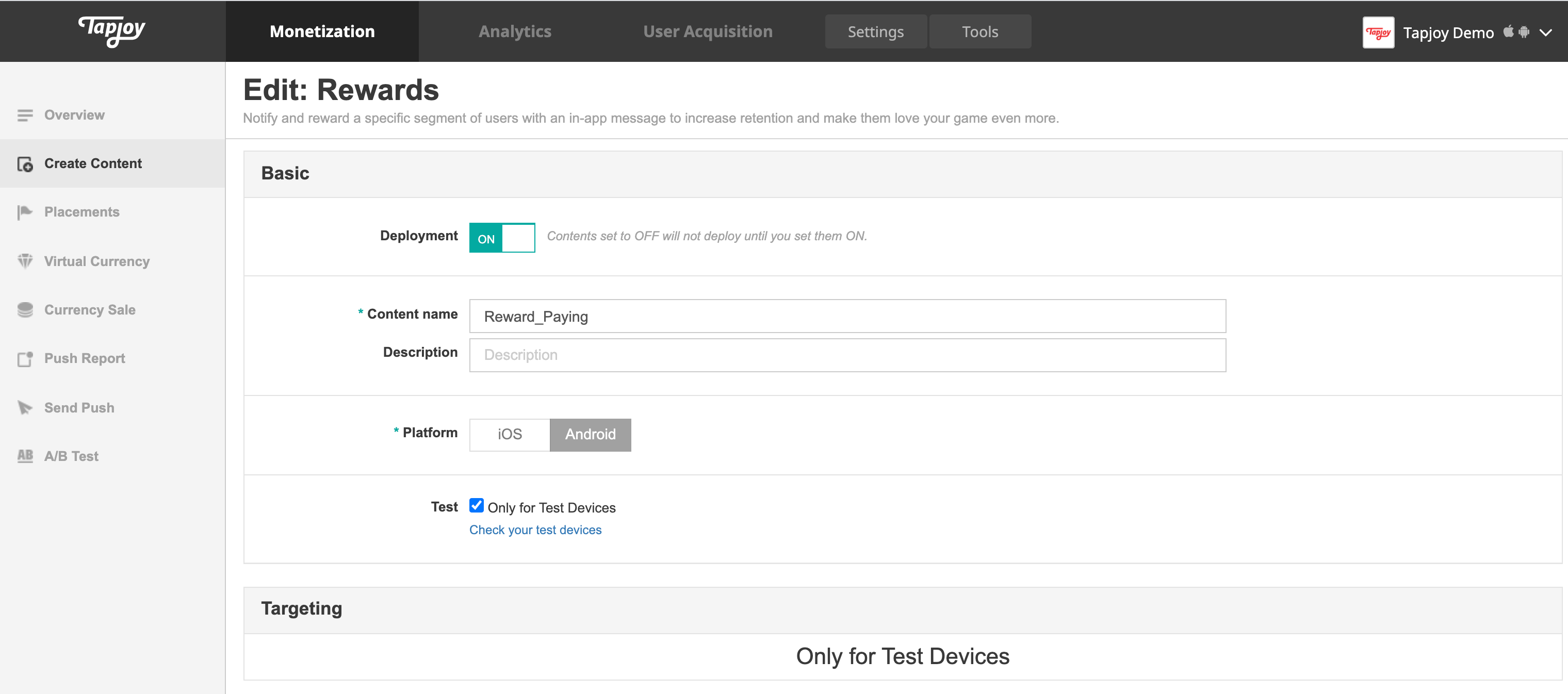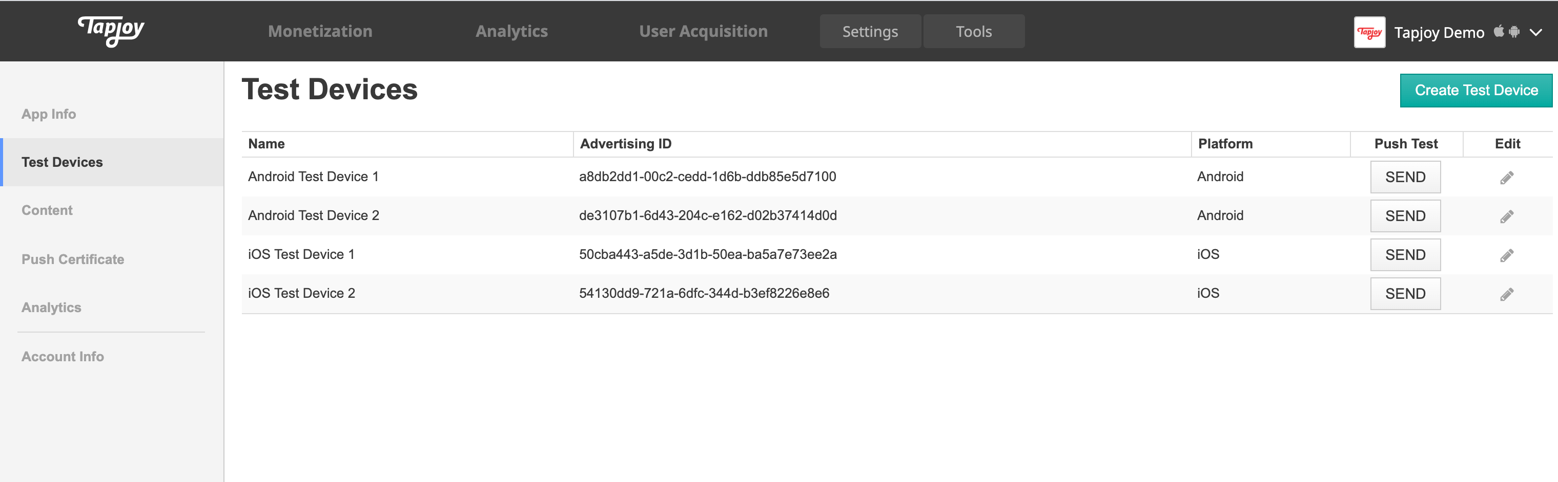 Test Devices open up additional Tapjoy features when you are developing your application. Devices registered as test devices can view content cards set to "only for test devices". This lets you test specific content units without showing them to all users. Test Devices will automatically turn on Tapjoy Debug Logging for themselves after the SDK connects to the server. Setting up test devices involves finding the test deivce id or advertising ID and adding that ID to the Tapjoy Dashboard "App Settings/Test device” panel. For more information, refer to the Play Console Help documentation on Advertising ID.